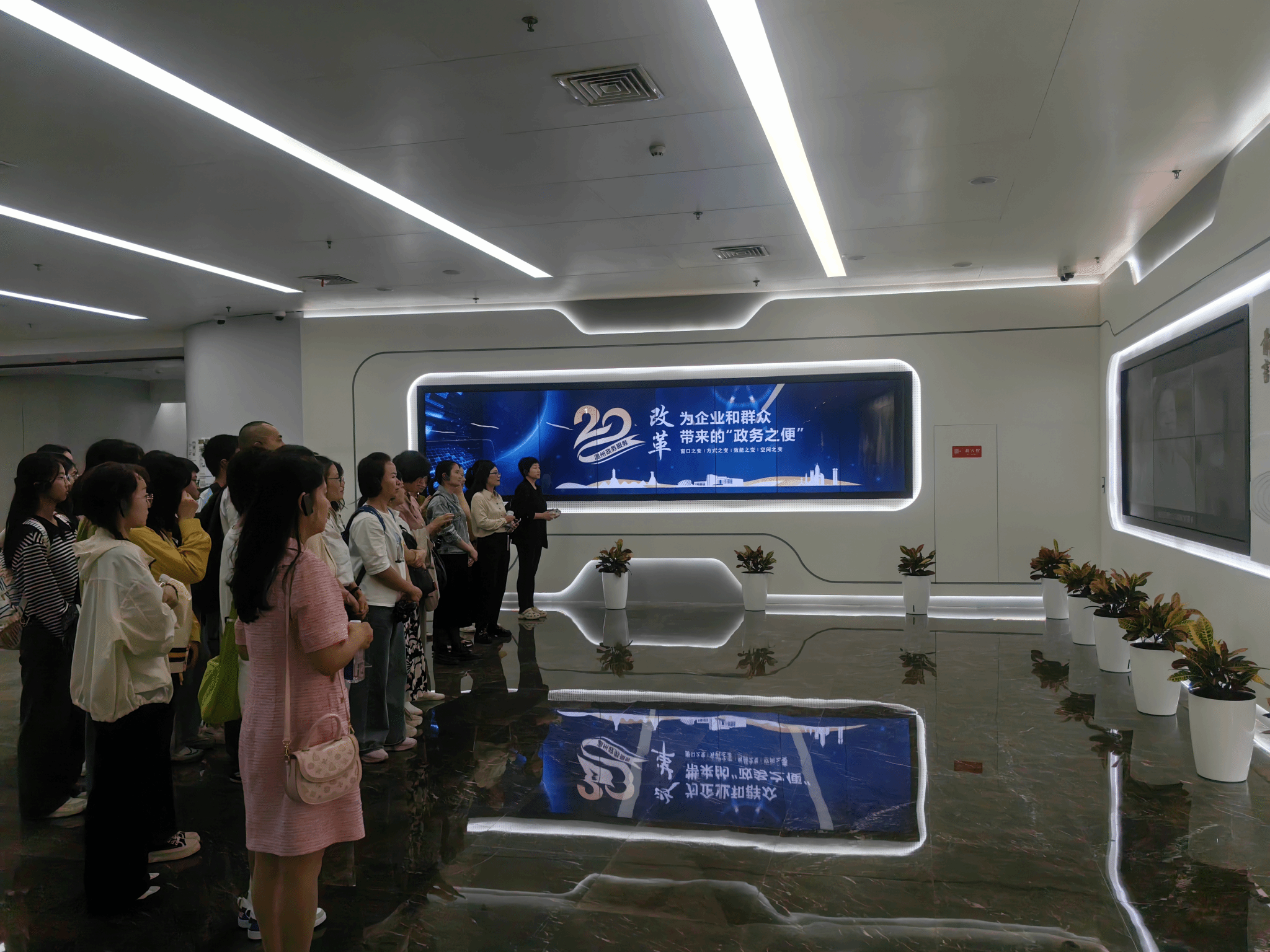 循着习近平总书记在浙江工作期间考察调研温州的足迹,第一站我们来到了温州市民中心参观学习,重温习近平总书记的殷殷嘱托,感悟思想伟力和精彩蝶变。温州市民中心现场教学点于2023年8月入选浙江省学习贯彻习近平新时代中国特色社会主义思想现场教学示范点。师生们先后参观了文化长廊、营商环境展示区、真诚服务示范窗等教学点。从视频中了解了20年温州政务服务牢记嘱托感恩奋进的历程以及企业群众对政务服务改革的获得感和满意度;从数据+图片中了解了“政务之变”“交易之变”。大家对“八八战略”温州实践成果有了进一步的了解,对温州政务服务改革有了更透彻的理解,对今后推进工作有了更清晰的思路。