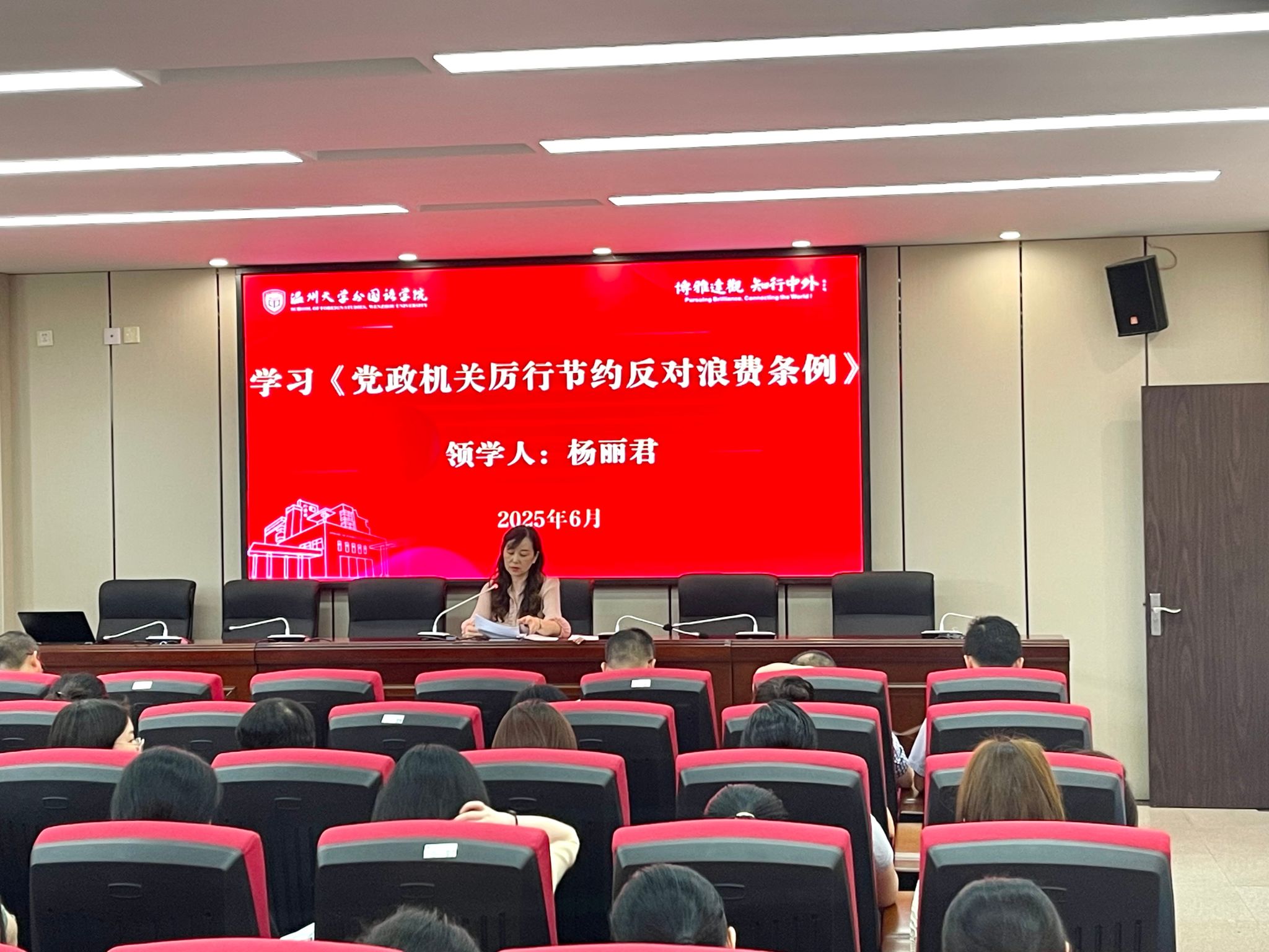 会上,杨丽君领学《党政机关厉行节约反对浪费条例》,从党政机关经费管理、国内差旅、因公临时出国(境)、公务接待、公务用车、会议活动、办公用房、资源节约等八个方面增强全体教职工勤俭节约意识,推动形成勤俭节约的良好风尚。