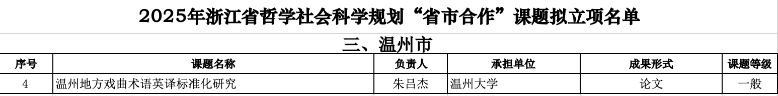 近日,2025年度浙江省哲学社会科学规划“省市合作”课题拟立项名单公布,我院朱吕杰老师课题《温州地方戏曲术语英译标准化研究》成功获批。这也是继去年后,我院再度获批该项目。