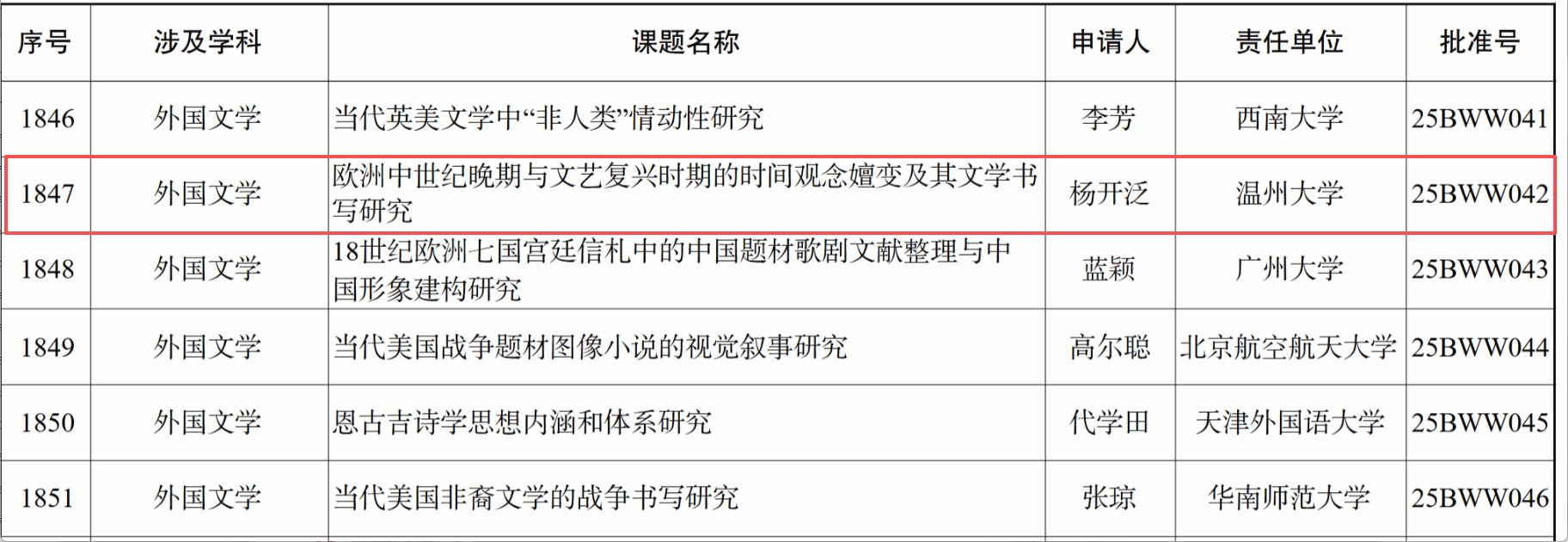 近日,2025年度国家社会科学基金年度项目立项名单正式公布。我院杨开泛老师申报的项目《欧洲中世纪晚期与文艺复兴时期的时间观念嬗变及其文学书写研究》成功获批立项。这一成果标志着我院在外国文学与文化研究领域取得了新的突破,也体现了学院在人文学科基础研究方面的持续积累与学术实力。