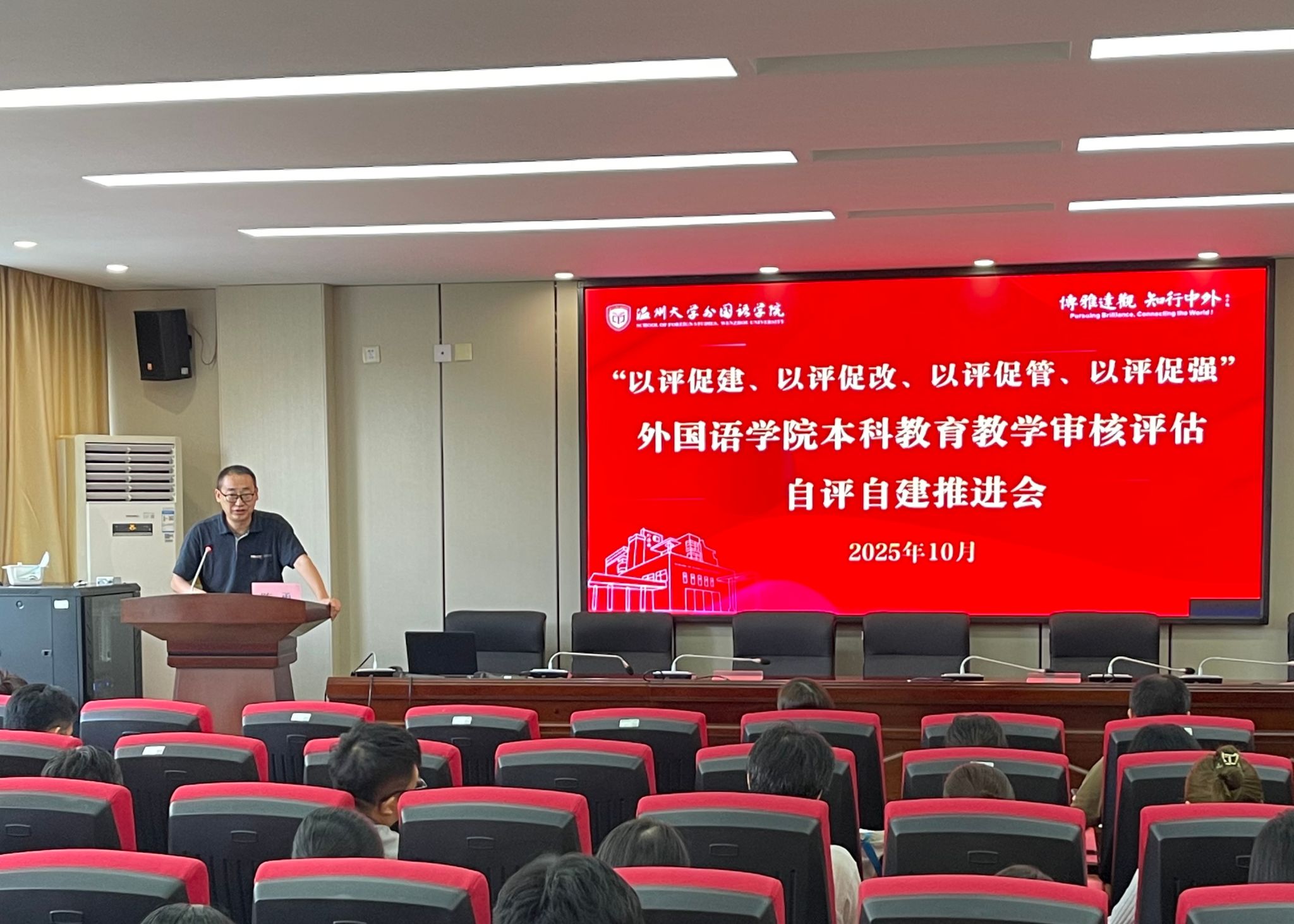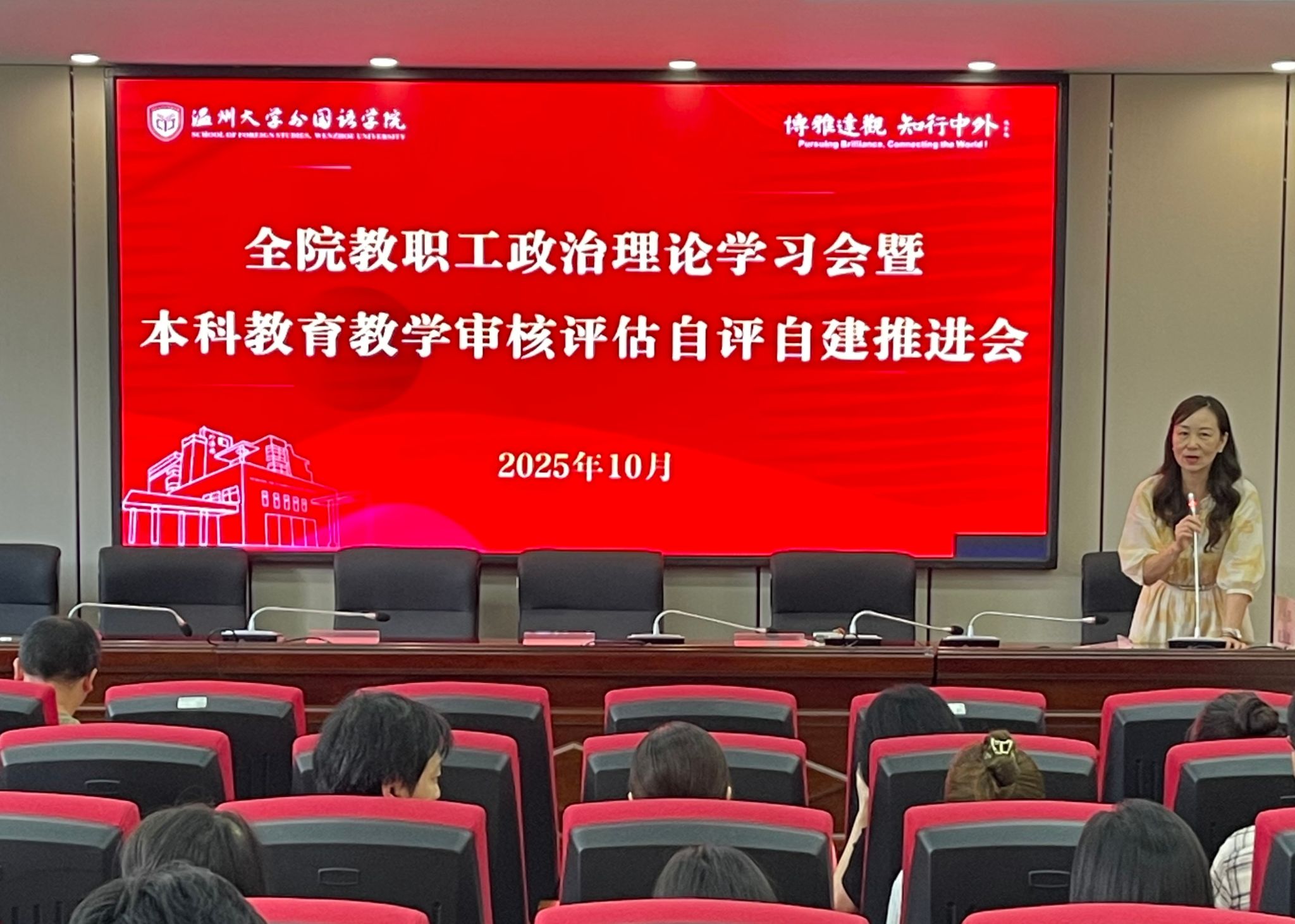 10月17日下午,外国语学院在外语楼214报告厅召开全院教工政治理论学习暨本科教育教学审核评估自评自建推进会,会议由学院党委书记杨丽君主持,全院教职工参会。