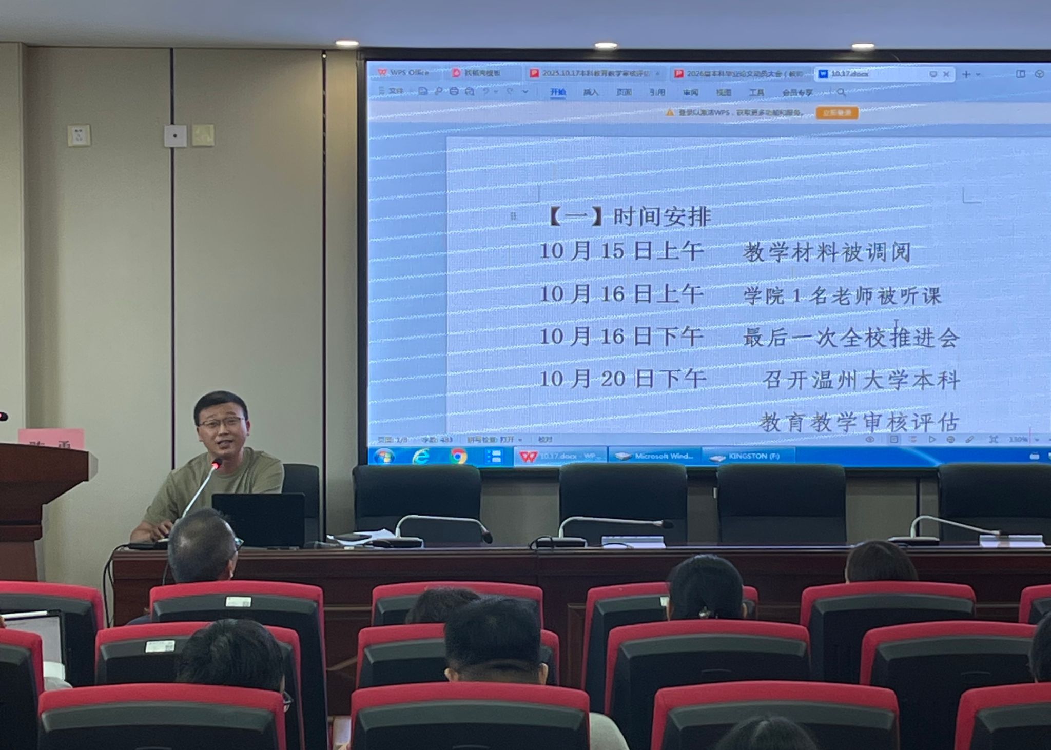 副院长何永成就本科教育教学审核评估相关工作和安排做重点讲解和部署,强调本学期审核评估五个重要时间节点,并就听巡课、试卷批阅、教学大纲、教案、平建工作应知应会等多个注意事项进行详细讲解,强调全院教职工应齐力共举,积极营造迎评氛围,共同为审核评估工作做好充分准备。