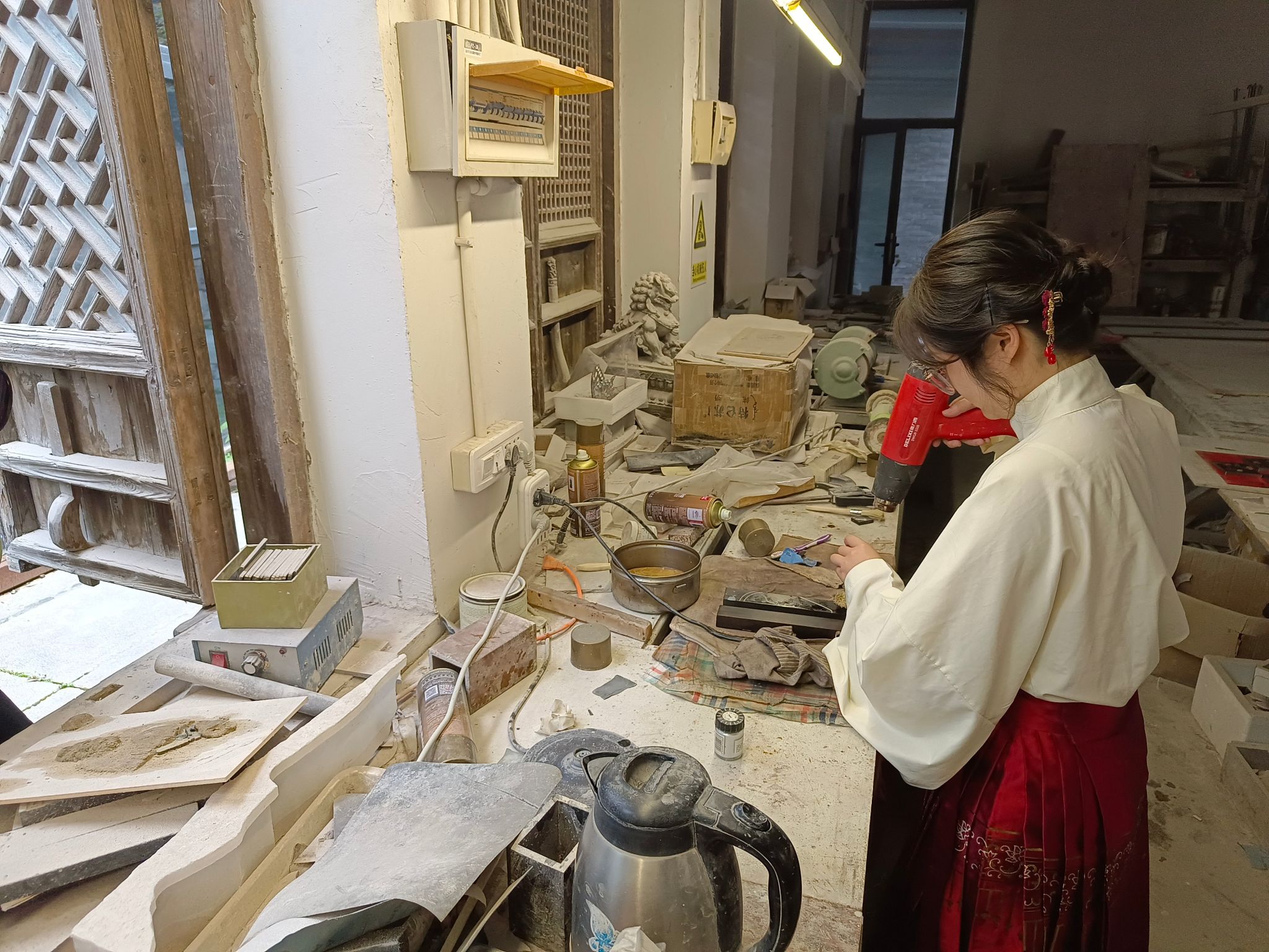 团队成员通过调研、走访、访谈,完成了文案撰写、实地拍摄、人物采访与视频剪辑,亲自拜访了温州市级彩石镶嵌非遗传承人缪一川先生,力求将彩石镶嵌的传统内核与时代新意相融合,用“短视频”的形式让这门古老技艺焕发出新的生命力。视频以“我”的成长为叙事线索,从童年里石屑飞扬的记忆,到重返故土、重拾手艺的顿悟,串联起“传承不是重复,而是延伸”的主题。拍摄过程中,我们与缪一川先生反复沟通细节,聆听他讲述如何在石头里雕出光影、在坚硬中孕育柔情——那不仅是一场关于“匠心”的生命教育,更是一堂关于“文化”的精神洗礼。