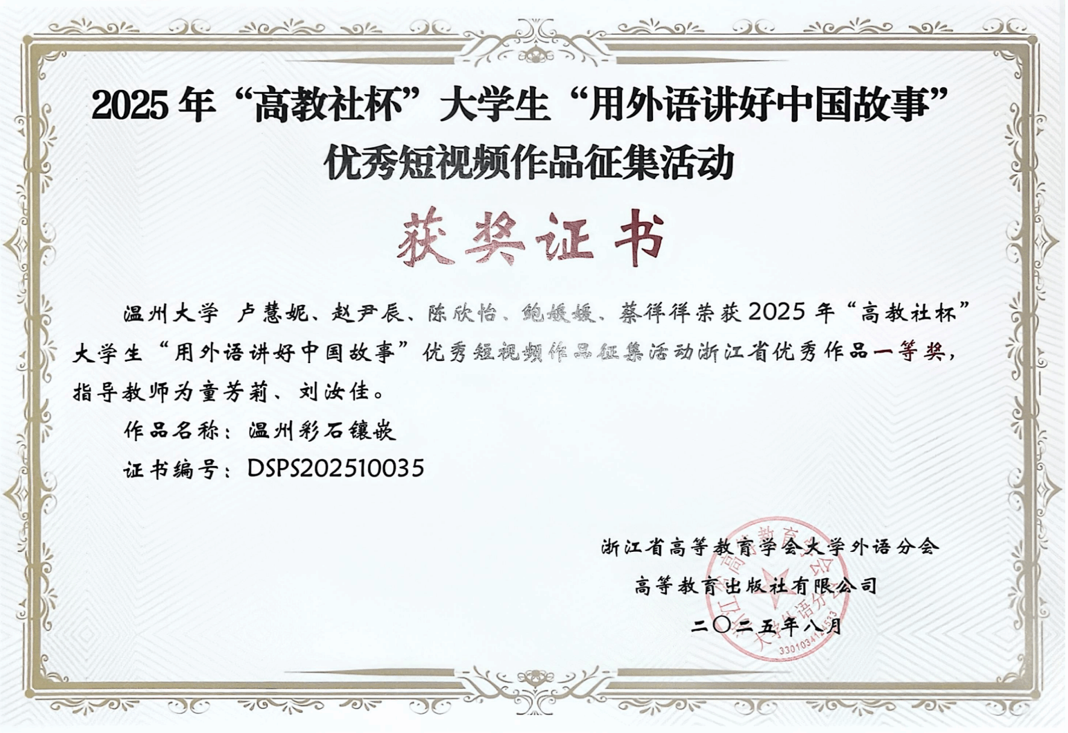 在刚刚落幕的2025年“高教社杯”大学生“用外语讲好中国故事”优秀短视频作品征集活动中,由温州大学外国语学院童芳莉和刘汝佳两位老师指导的《Colored Stone Inlay(彩石镶嵌)》作品从全国29个省市自治区的721所高等院校中的4539件投稿作品中脱颖而出,荣获省级一等奖的好成绩!