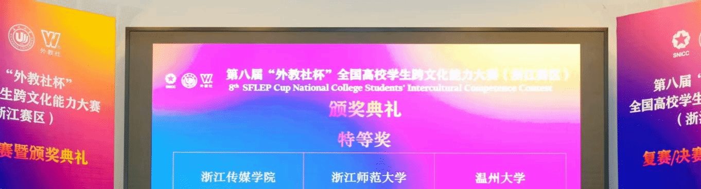 为探索如何更好地实现全球化表达,提升对外传播的亲和力与实效性,让世界更为具象地感知中国,11月22日至23日,第八届“外教社杯”全国高校学生跨文化能力大赛(浙江赛区)复赛/决赛在温州大学成功举办。该赛事由浙江省外文学会、温州大学和上海外语教育出版社联合主办,温州大学外国语学院承办。经过2天的激烈角逐,浙江传媒学院、浙江师范大学和温州大学代表队在决赛中勇夺“特等奖”。