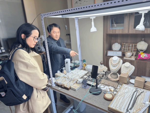 随后,调研组实地考察了全球最大的淡水珍珠交易市场——华东国际珠宝城。这里年交易量占世界淡水珍珠总量的70%,目前活跃着超过5000家直播间。调研组亲身感受了“诸暨珍珠”通过数字化转型,利用多渠道国际推广不断提升国际影响力的蓬勃态势。