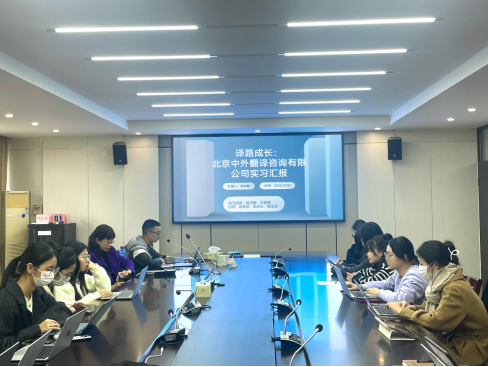 在翻译硕士2023级实习总结大会环节,多位学生代表结合自身实习经历作专题汇报,全面展示了翻译硕士在不同实践场景中的学习收获与能力提升。叶根豪同学通过线上方式,围绕其在上海译国译民翻译服务有限公司翻译生产部的实习经历进行分享,系统介绍了翻译公司的业务结构与岗位分工,重点汇报了笔译、质检、排版及辅助性工作的具体内容,涉及证件、新闻、商业及图书类文本翻译,并结合AI工具与专业翻译软件的使用,梳理了翻译生产流程与质量控制要求。吴欣敏同学代表实习小组,汇报了其在北京中外翻译咨询有限公司总部的实习情况,从国际工程与装备制造领域的翻译任务入手,详细介绍了翻译与质检并行的工作模式,重点分享了MemoQ、Trados、Xbench等工具在项目管理和质量保障中的实际应用体会,并从团队协作与高效沟通角度总结了实习对职业素养培养的促进作用。郑婷婷同学代表实习小组,围绕在天津档案馆的实习经历作系统汇报,介绍了线上线下相结合的工作模式,重点说明了审校、多语质检、机器翻译与CAT整合等任务内容,并从专业能力提升、项目协作流程及档案翻译严谨性要求等方面总结了实习收获。陈子婴同学则围绕其在温州市海外传播中心的实习经历展开分享,重点介绍了口译服务、英文公众号笔译及视频项目制作等实践内容,系统呈现了翻译专业在国际传播与多模态传播场景中的应用路径。学生们的汇报内容详实,充分展现了翻译硕士在不同实习平台中的实践成果。