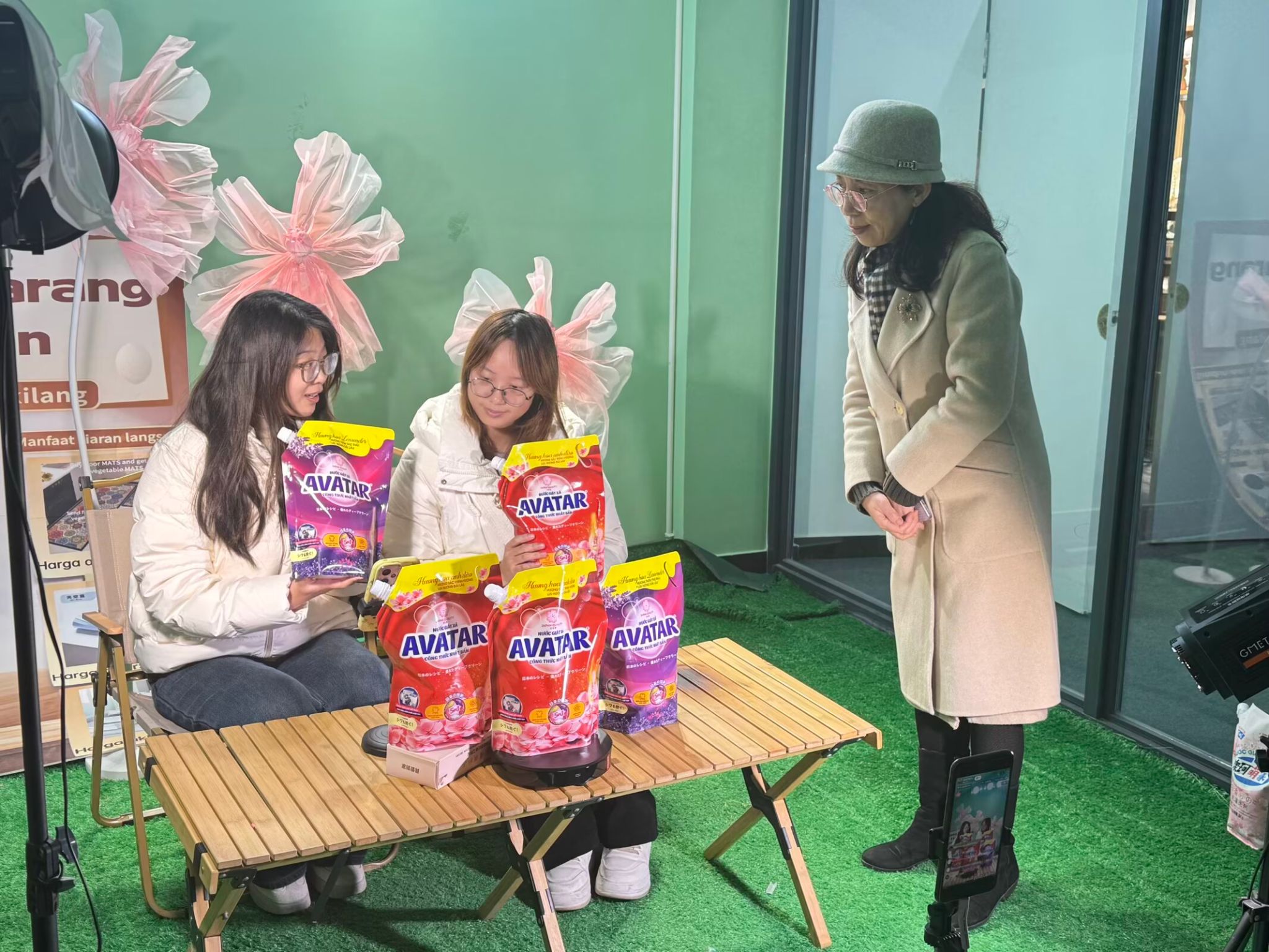 在直播间:学员们化身双语主播,手持商品,面对镜头侃侃而谈。英语战队流利地介绍产品卖点,西班牙语战队则展现了拉美市场的热情与亲和力。