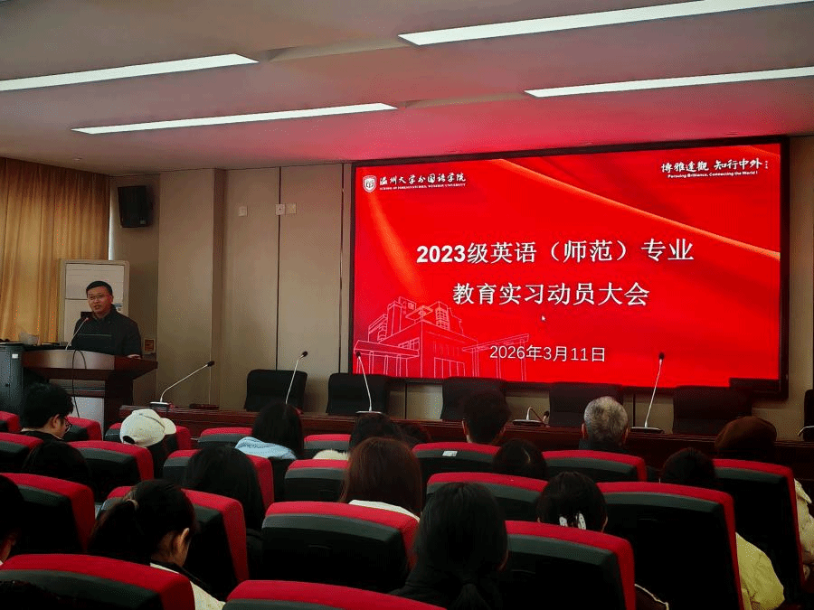 为进一步落实2023级英语(师范)专业教育实习工作,明确实习任务与要求,保障本学期实习有序推进,我院于2026年3月11日上午9:00在外语楼214报告厅隆重召开2023级英语(师范)专业教育实习动员大会。本次会议由薛丽芳老师主持,何永成副院长、相关指导教师及2023级全体英语(师范)专业本科生齐聚一堂,共同开启实习新篇章。