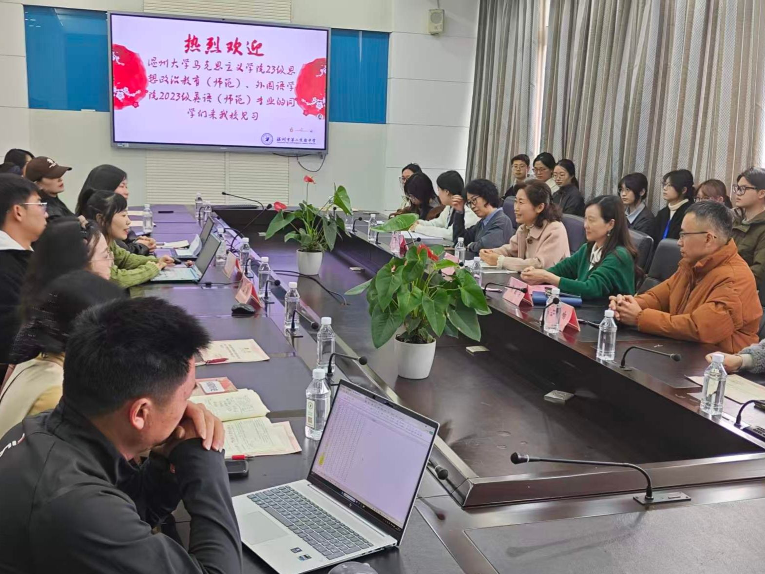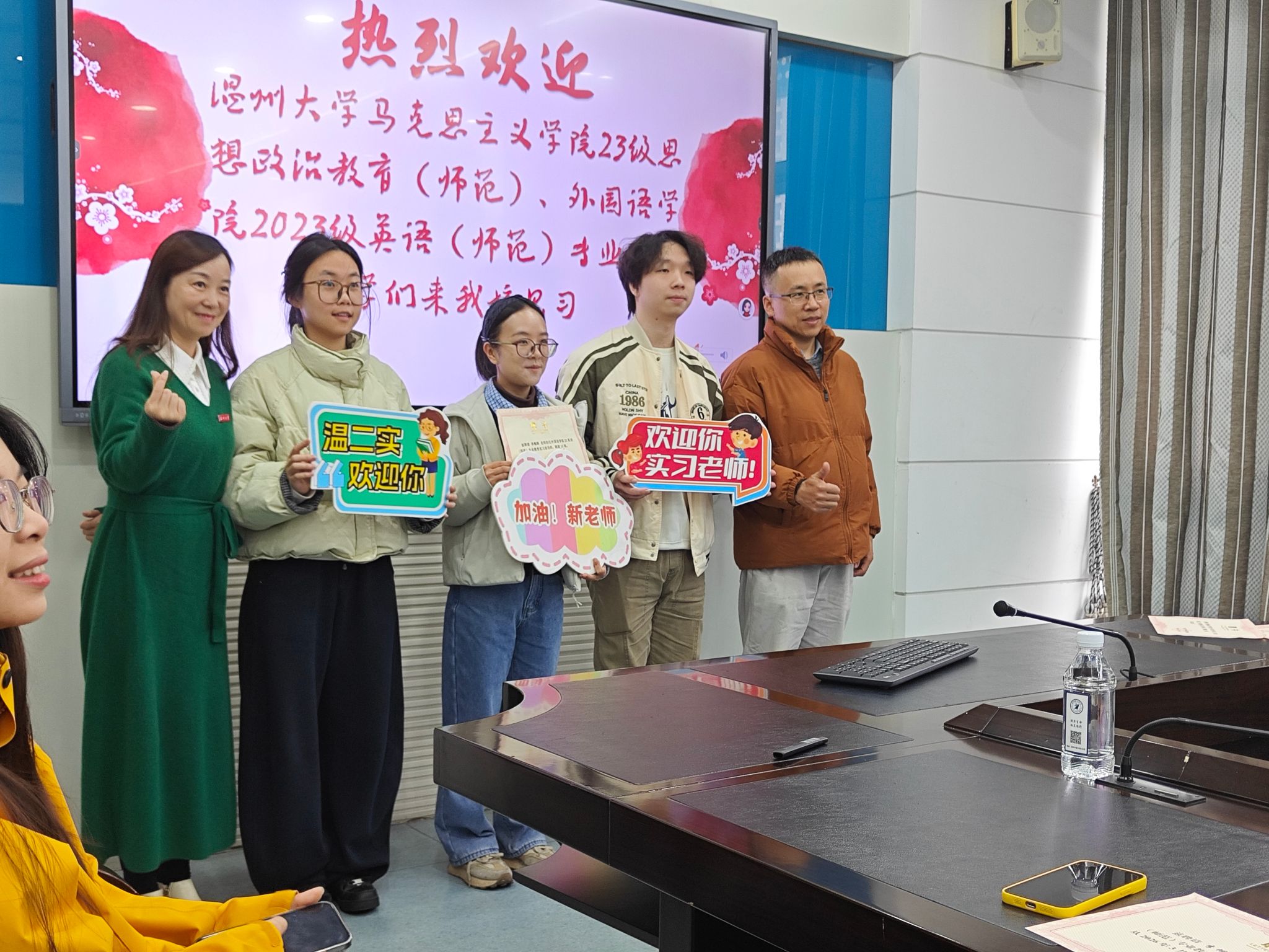 3月17日上午9时,温州第二实验中学勤政楼402会议室迎来了一场温暖而充实的实习欢迎与指导见面会。温二实副校长陈珊景、政教处副主任金麒、教务处主任冯超伟等校领导,以及由优秀班主任与英语学科骨干教师组成的指导团队齐聚一堂,共同迎接温大师生的到来。
