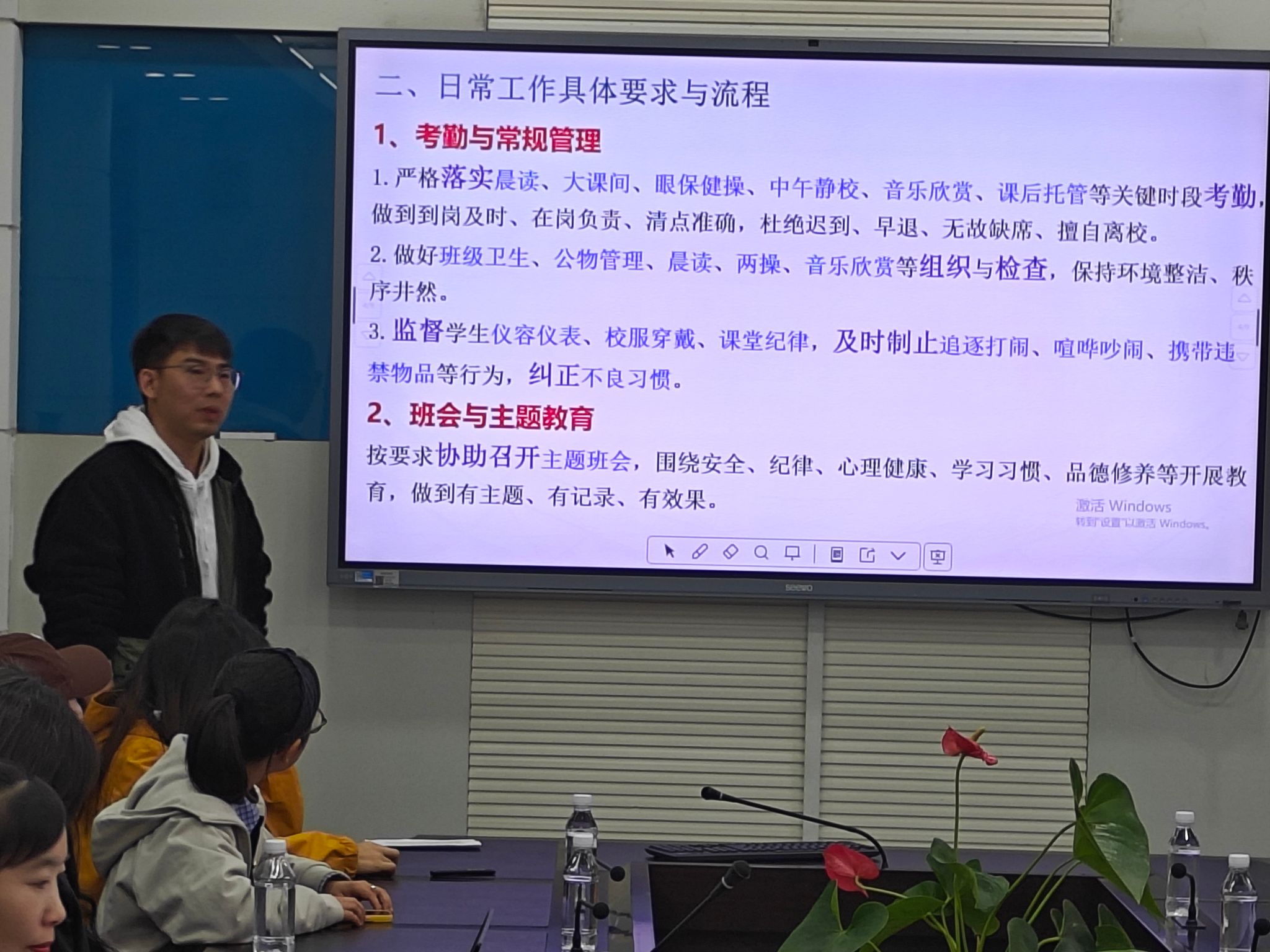 教务处主任冯超伟对实习生的后勤保障与校园规范作了统一安排,明确了办公地点与用餐事宜,并提醒大家妥善保管个人物品,规范停放电动车,严格遵守校园安全管理规定。