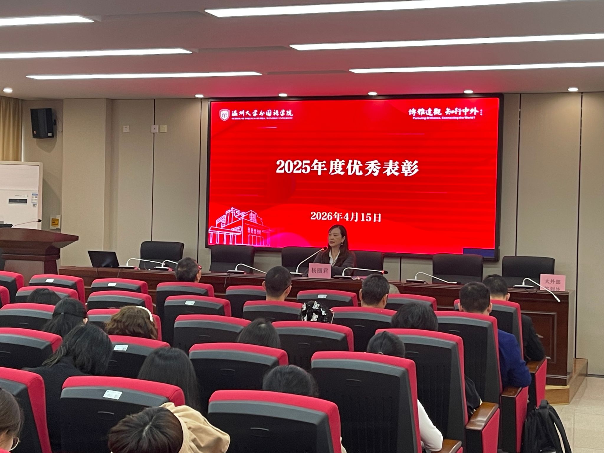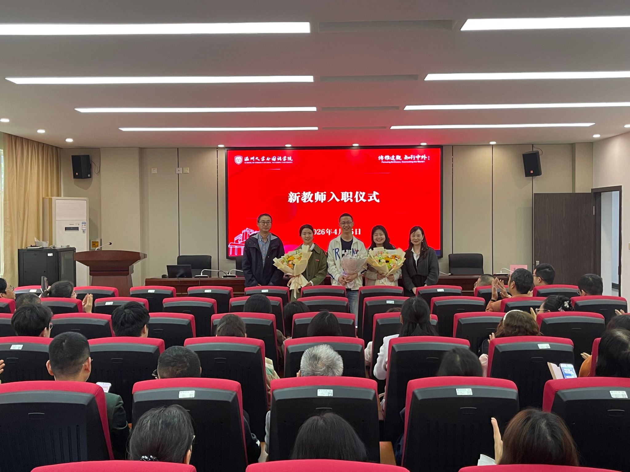 会上,学院为 2025 年引进的 3 位优秀教师举行入职仪式并为新教师佩戴校徽、敬献鲜花,同时表彰 2025 年校级优秀个人并为获奖教师颁发荣誉证书。
