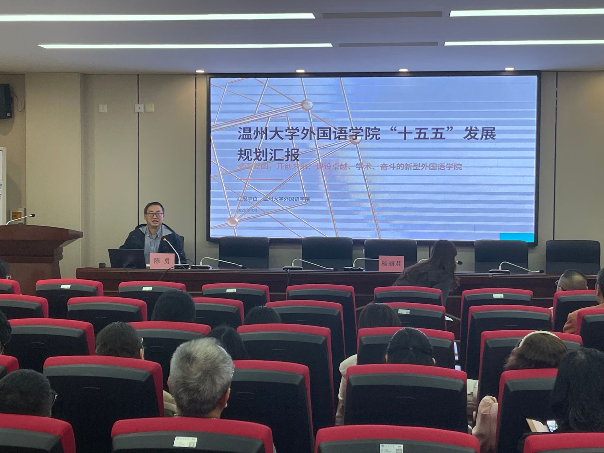 陈勇院长总结 2025 年及近期工作,部署学院“十五五” 发展规划 ,聚焦学科建设、专业提升、科研创新与社会服务,坚持重点突破、特色发展与守正创新,对接国家战略、服务地方与学校发展,着力打造 “卓越外院、学术外院、奋斗外院”文化品牌,培养高素质外语人才。杨丽君书记结合陈院长部署的工作任务与学院发展实际,对全体教职工提出希望:要进一步强化责任感、危机感、使命感,凝心聚力、团结奋进,确保学院 “十五五” 发展规划开好局、起好步,奋力推动学院各项事业高质量发展再上台阶。