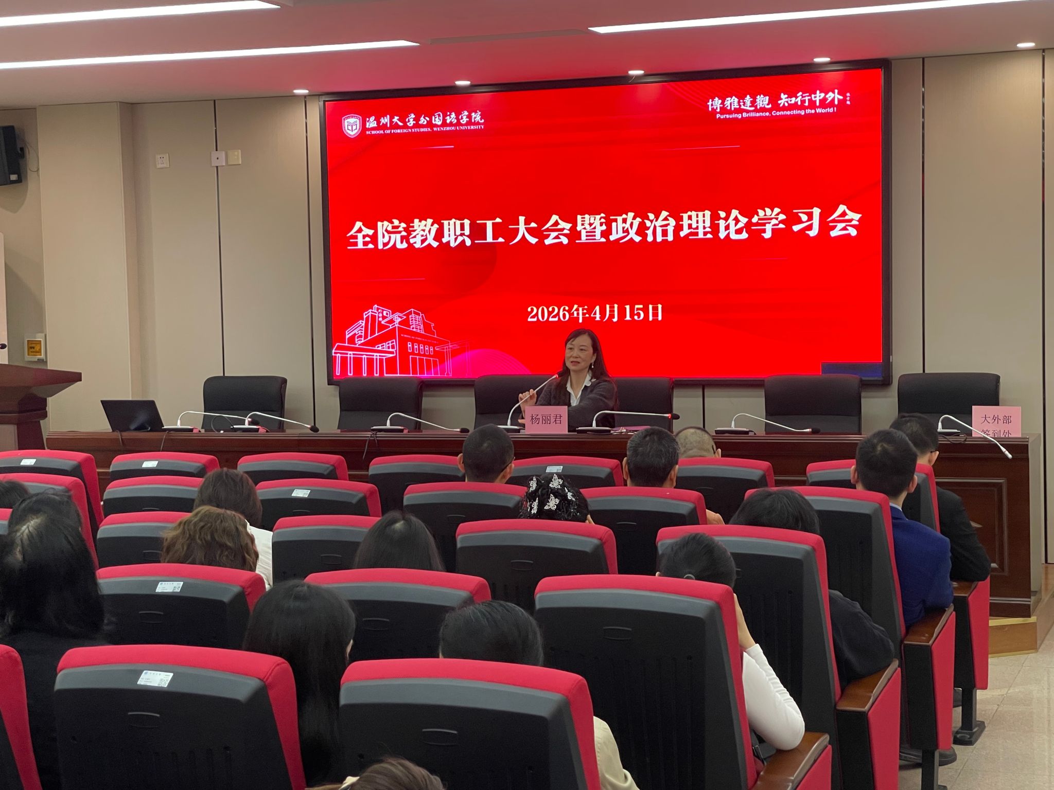 4 月 15 日下午,外国语学院在外语楼 214 报告厅召开全院教职工大会暨政治理论学习会,学院领导班子及全体教职工参会,会议由学院党委书记杨丽君主持。