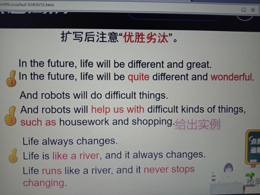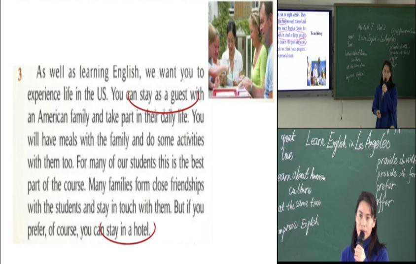 第三节是陈银伟老师教授的写作课,老师先让学生想象未来的自己在工作生活方面的变化,通过练习一写一篇未来的自己在生活工作中变化的作文,然后教授学生在改正过程中注意时态、要点和人称,练习二谈谈自己的运动和饮食习惯写一篇小作文传授学生需要把握的三要点,之后又练习三练习四不断引导学生提高写作能力,其次穿插介绍写作方法的口语对话小视频缓解学生吸引学生的注意力,然后运用几篇作文请学生列出其中的关键词,逐步教授学生将内容“详略得当”“优胜劣汰”的写作方法,之后以“Life in the future”为题运用本课所学方法写一篇作文,最终掌握用英语描述未来生活的技巧,运用“审列扩连查抄”写作策略模仿写作。