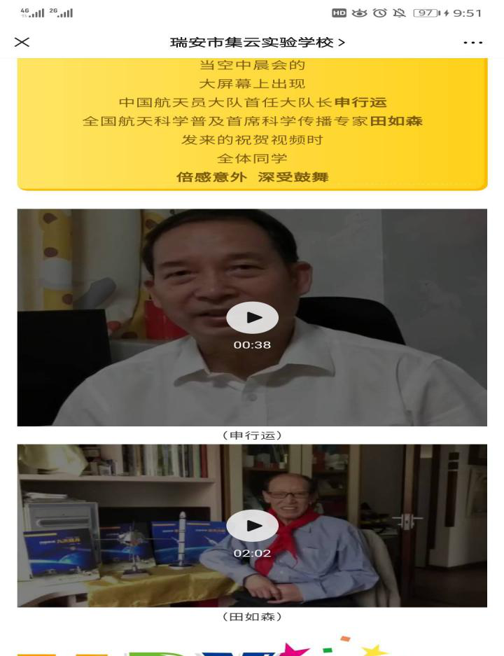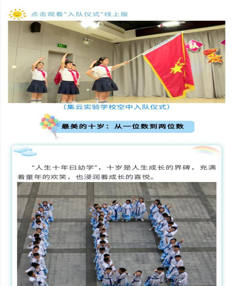此外,我们还了解了集云实验学校近期的德育活动。首先是疫情之下的六一儿童节,学校以线上线下相结合的方式,赠送了小朋友最好的六一节目。线下的教室里红旗飘飘,一年级的小朋友戴上了鲜艳的红领巾,线上展开了新队员的入队仪式。还有畅享美食、文艺汇演和观看电影的方式,为孩子们过了一堂有意义的六一儿童节。初次之外,还展开以“我和祖国一起飞”为主题的空中晨会,盛情邀请了中国航天员首任大队长申行远和全国航天科学专家田如森为同学们发来祝福。引领少年儿童怀揣梦想,奋发向上,学会自律,收获成长。