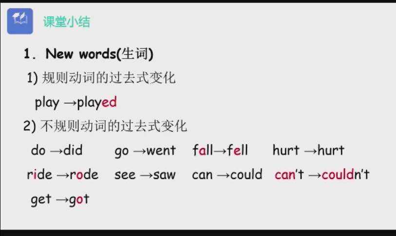 第四节课是由李蝶老师带来的。课堂一开始,老师由一首歌曲引出今天的上课主题。之后便要求同学们一人分饰两角来进行对话讨论从而对学习内容有一个更深的了解。之后老师便带领学生学习有关的英语单词和英语表达,不仅介绍了英语的固定搭配,还耐心的带领学生朗读单词,讲解音标,学习内容非常详细。最后对课程做了总结,强调了对不规则动词的过去式变化的记忆。