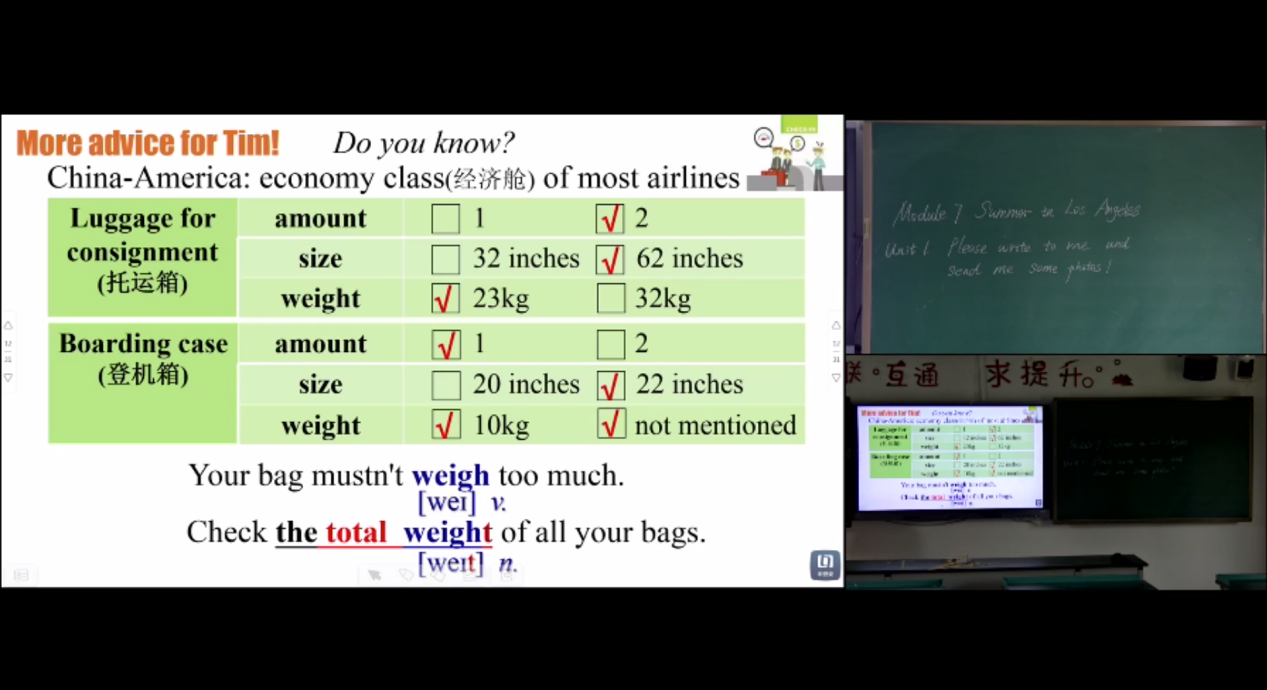 第二节课,宋蒙雨老师带来了Summer in Los Angeles 的课程学习,并在课程的开头就给出了清晰的学习目标:会听、读、写相关的单词词组;能听懂相关对话并获取信息;能谈论自己的假期计划与活动并指定合理的方案以及能养成做事有计划、生活有条理的习惯。接下来老师为学生们一步步清晰的讲解了内容,并给学生们一些有趣的问题和充足的思考的时间。在此同时,老师不忘基础的掌握,不时穿插单词的拼写和发音。课程的最后还设了关键词组的记忆与考察,让同学们加深印象。接着以对开始时的目标的checklist,结束了这堂令人印象深刻的空中课堂。