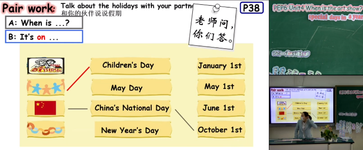 2020年6月11日,温州大学英语师范全体师生观看了四五六年级的英语空中课堂。第一节课是由李蝶老师带来的pep6 Unit4 A Let’s talk. 首先,李老师就给同学们一个30秒的小练习,在这段时间内尽可能多的说出关于月份和节日活动的同类词,有效的调动了学生的积极性。同时也引入了本节课的学习目标”Special days in a year”。接下来老师通过“pair work”,老师问自己答的形式,来讨论自己的假期方式。介绍部分结束后正式进入课文内容学习,老师非常注重英语语音,在自己读时特别标注出升调降调语气变化等细节。最后课堂快结束时布置了一个一人分饰两角的对话作业,巩固课堂知识。