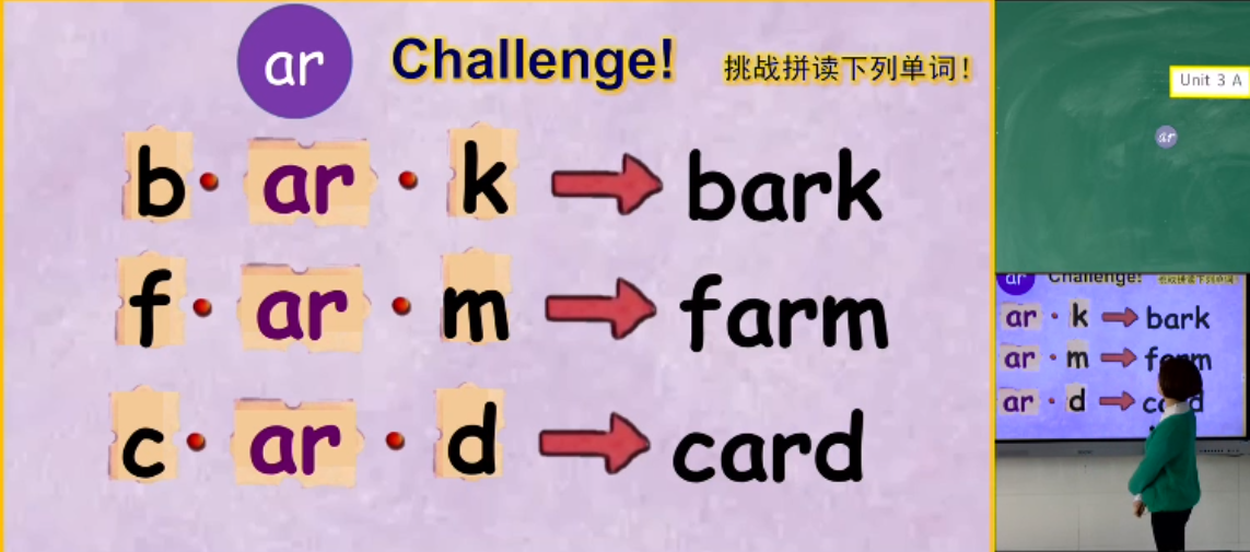 第五节课来自刘盈盈老师的Let’s spell. 在上课之前,老师声明了课堂纪律,要求学生认真听课。进入课堂后通过观看视频和有节奏的朗读书上的课文,反反复复加深学生的记忆并体会到单词之间的相似之处,在她的引导下,学生可以了解到含有er, ir, ur和ar, al单词的读音相同。