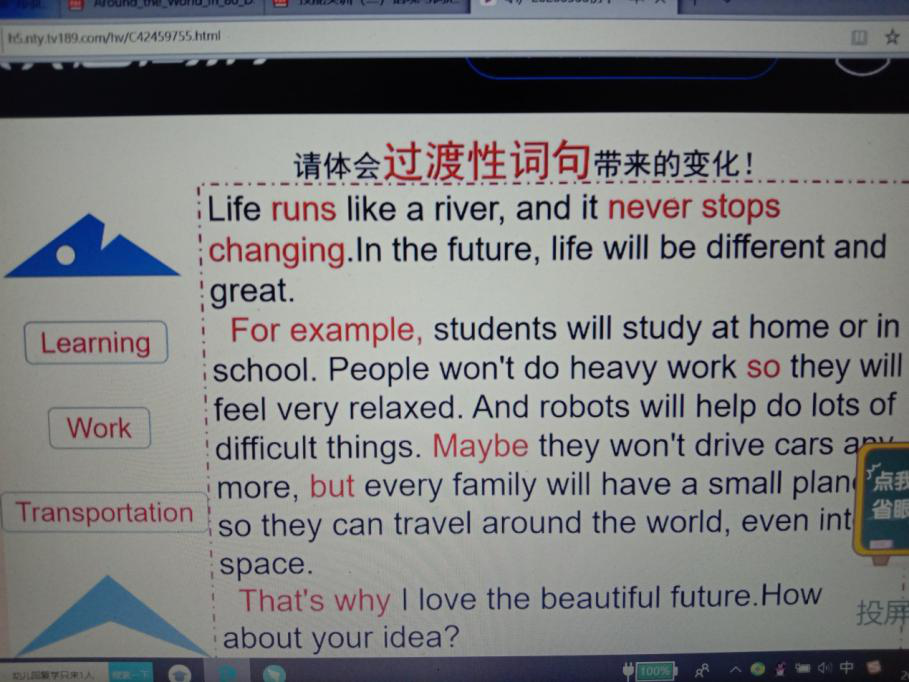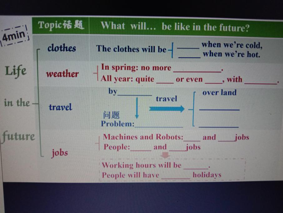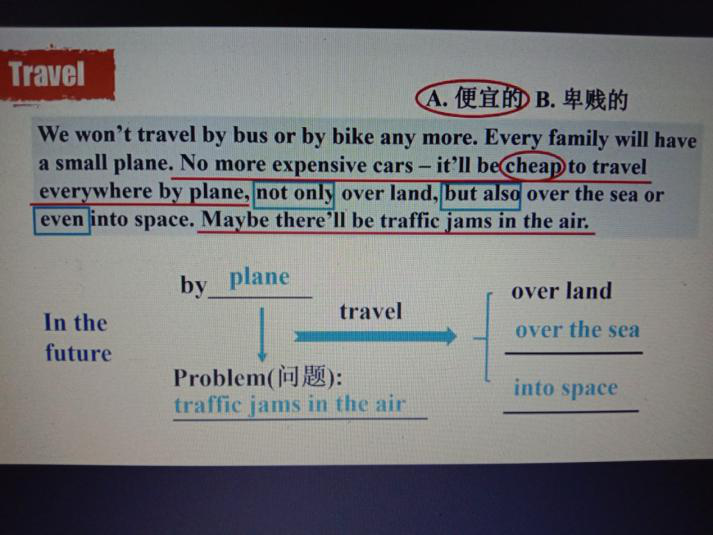 第二节是由廖佩婵老师教授的Unit2 Every family will have a small plane,首先老师带领学生回顾第一单元的语言知识点及将来时态,然后由填空“will/won’t”的练习掌握重点短语“not only, but also”并引入今天所学内容,发挥想象讨论未来机器人在我们将来家庭生活中的重要作用,听课文录音,在规定时间内阅读文本回答问题,然后运用头脑风暴选择“clothes、weather、travel and jobs”四个主题回答将来可能发展的变化,每一个主题对应一个文本,学习其中包含的重点词汇与句法结构,之后学习重点词组并运用其造句最终达到可以熟读课文掌握基本词汇与对未来发生的改变的独特思考的程度。