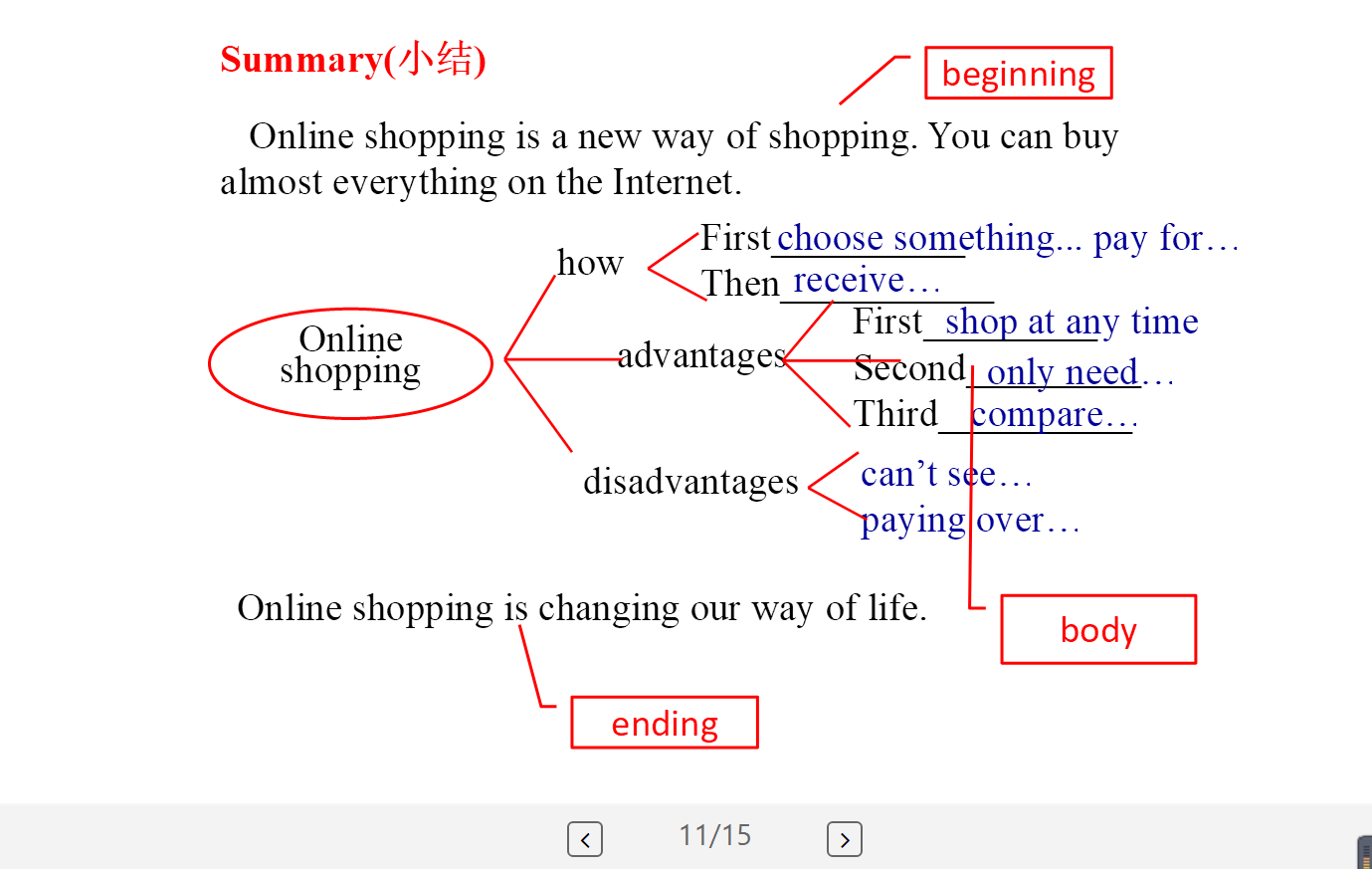 2020年6月2日上午,温州大学英语师范的同学通过线上见习观摩了瑞安集云实验学校由董邦新老师授课的M5U2《you can buy everything on the internet》。课上,董邦新老师从学生日常出发,以互联网设备普遍运用于生活中的现实作为话题切入点,并准备了马云及阿里巴巴相关视频,活跃了课堂氛围并成功引入课文话题。通过让学生快速阅读课文全篇,老师和学生一起总结出从标题和段首句提取全文大致信息的经验。整个课堂教学有序高效。同时,老师通过表格方式,把本单元对比不同购物方式并分析事物利与弊的重难点融入课堂之中,成为课堂的一大亮点。让人印象深刻的还有梳理总结部分,老师通过了思维导图的方式将本次课堂做了短暂的回顾,清晰而简洁。在最后的自由讨论部分,学生积极参与,讨论热烈,对于不同购物方式各抒己见。