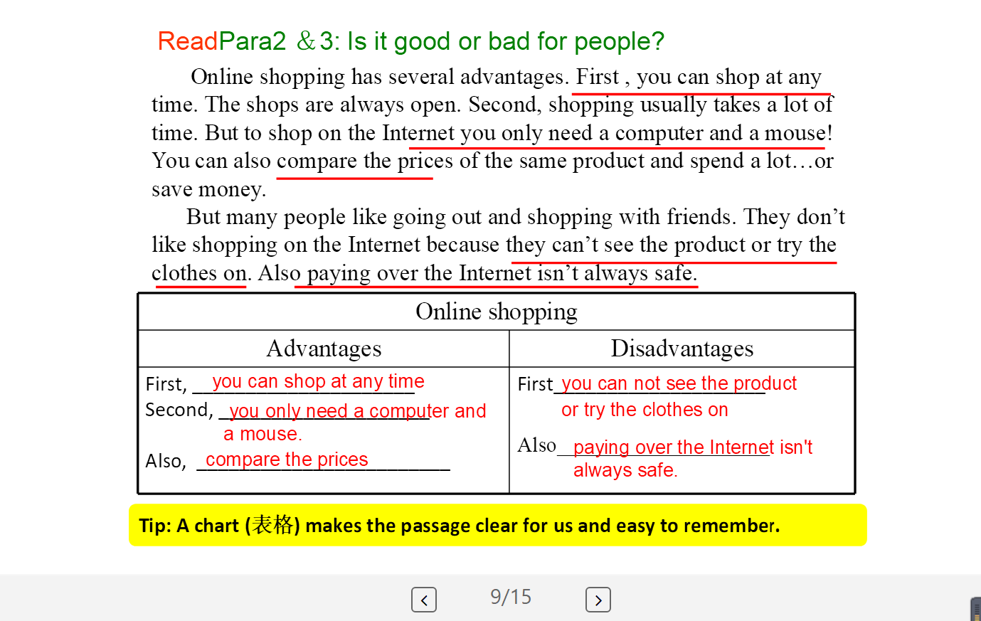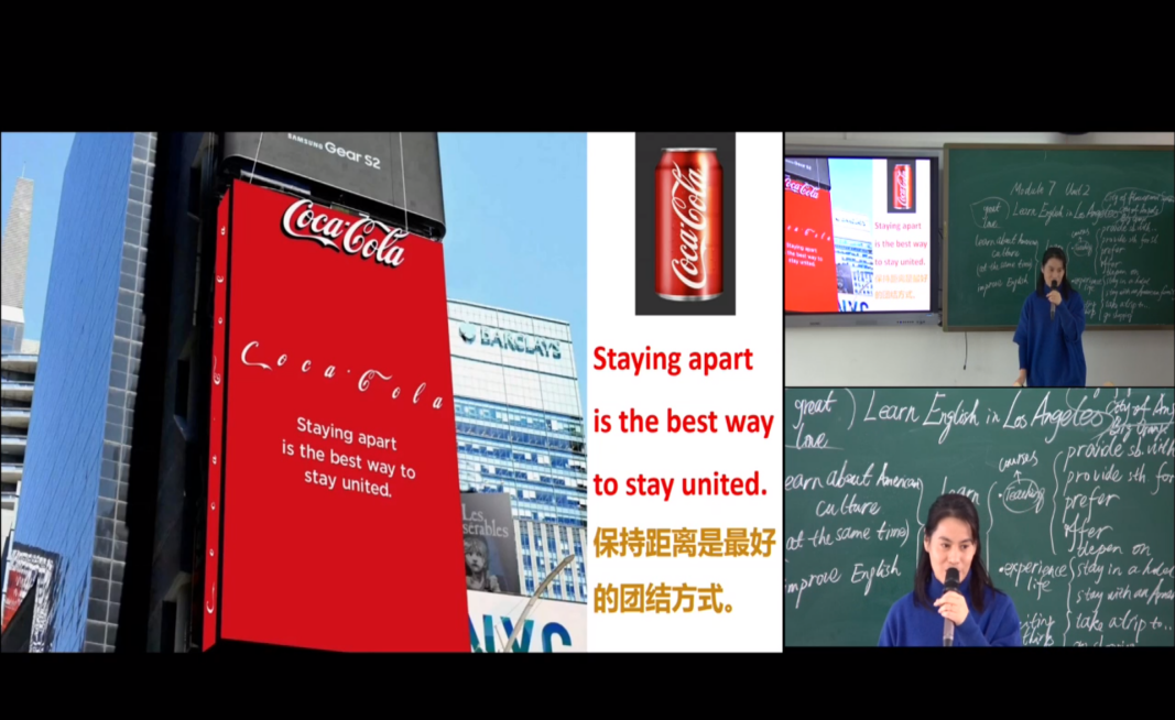 第三节课是虞文茜老师带来的Book8B Module7 Unit2的课文学习,老师先让同学们熟悉课文单词,然后用一个视频让同学更了解文章也让同学们的听力有所锻炼和提升,接着老师一段一段的和学生讲解课文,并且结合课后练习和留时间给学生们精读文章回答问题使学生更能读懂文章,并理解段落与标题的关系,也能运用不同的阅读策略获取信息。老师还给出了让同学们思考的问题,与同学们互动交流,更寓教于乐,给出了很多当下时髦有趣的广告,让同学们在疫情中学会保护自己,记得保持距离。