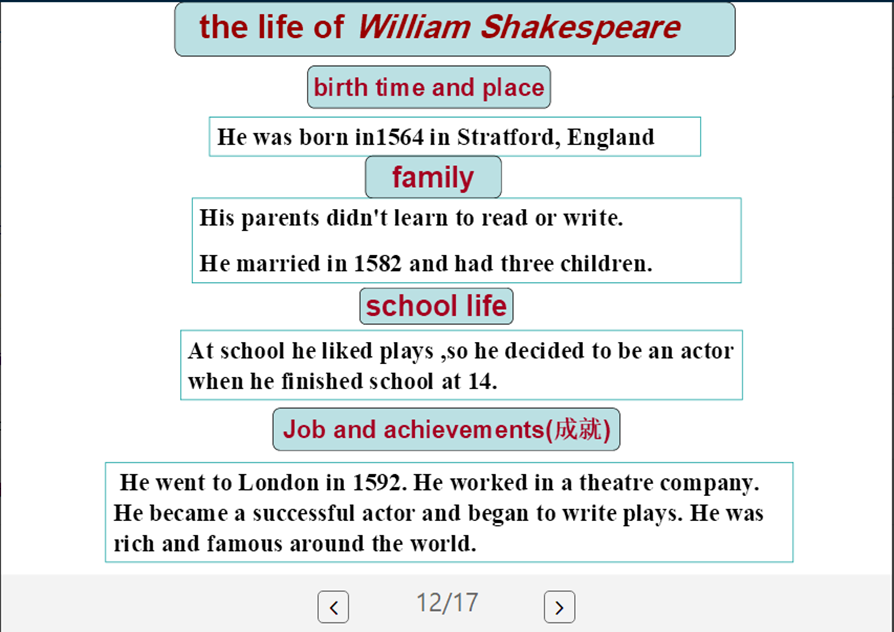 M9U2《He decided to be an actor.》由张敏老师授课。课程的难点是一般过去时的掌握,因此课程导入是同学们回答过去所做的行为,提醒学生们正确运用动词过去式。老师带学生们了解了莎士比亚的人生经历通过梳理课文的时间线,不仅是让大家明白所处这个好时代心存感恩,同时也激励学生通过努力换得成功。