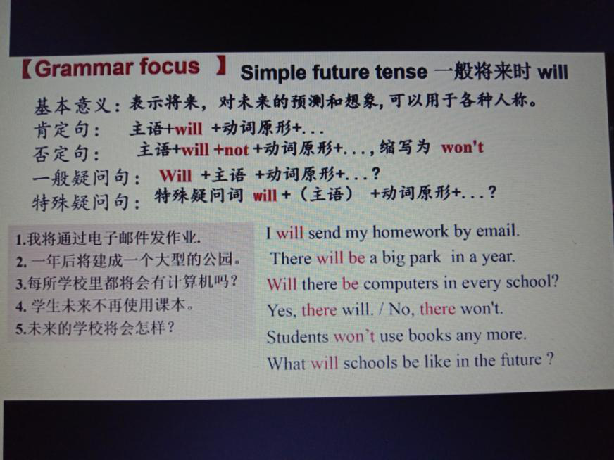 第一节由陈芙芸老师授课Unit1 Everyone will study at home,课上,由头脑风暴引入激发学生思考目前与未来学校发展变化,与学生进行口语表达与交流,并通过想象描绘未来电子设备在学习中的作用与普遍性从而进入今天所学内容,并带着问题阅读文本寻找答案,引导学生开放式思维,之后观看英语口语对话小视频来畅所欲言表达自己的想法,熟练掌握语言后开展一部分重点词汇的练习加深印象,然后学习文本中的重点语法,完成填空练习将一般将来时的语法、句子结构与运用熟练掌握。并通过造句练习对比will与be going to一般将来时的两种形式明确区分他们的运用。最后总结:运用新词汇达到听懂谈论未来的对话,可以熟练朗读课文并运用will表达对未来的想象。