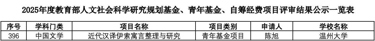 近日,教育部社科司发布了2025年教育部人文社科基金项目评审结果公示,我院陈旭老师主持的“近代汉译伊索寓言整理与研究”课题获得立项。