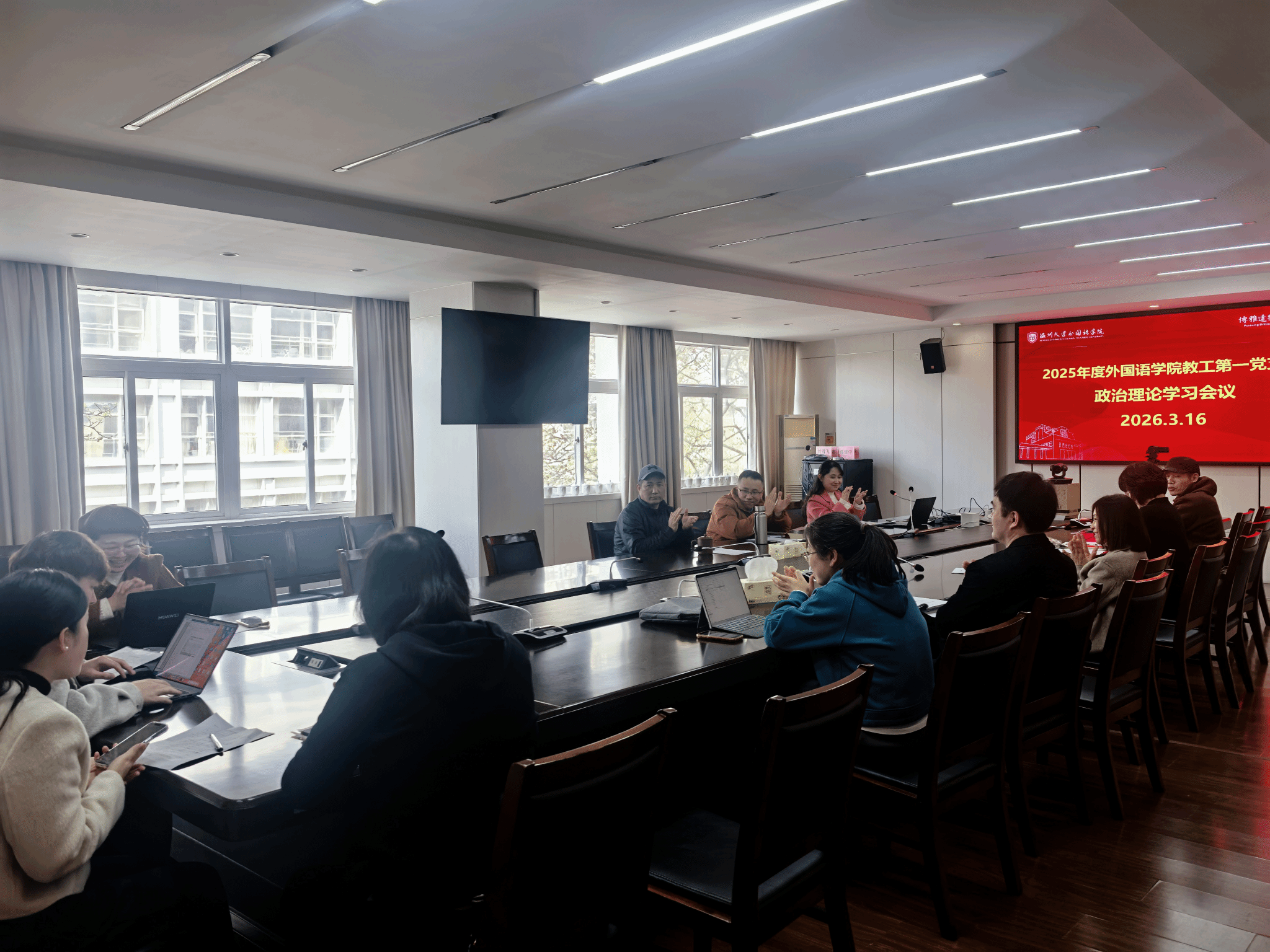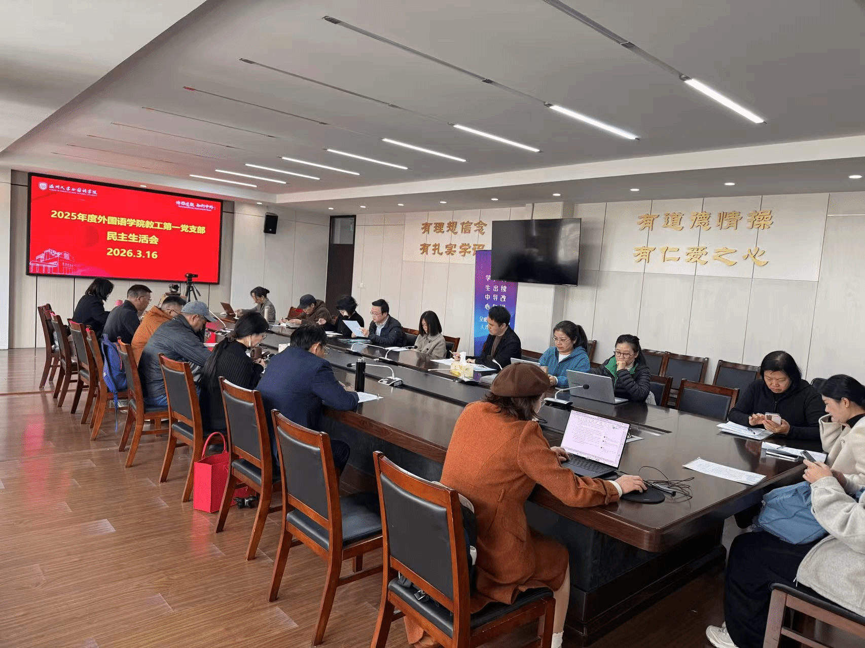 为进一步加强基层党组织建设,提升党员教师的政治素养与履职能力,2026年3月16日,温州大学外国语学院教工第一党支部在学院212会议室召开2025年度党支部民主生活会暨专题政治理论学习会议。会议由副书记童芳莉同志主持,支部全体党员悉数到会。
